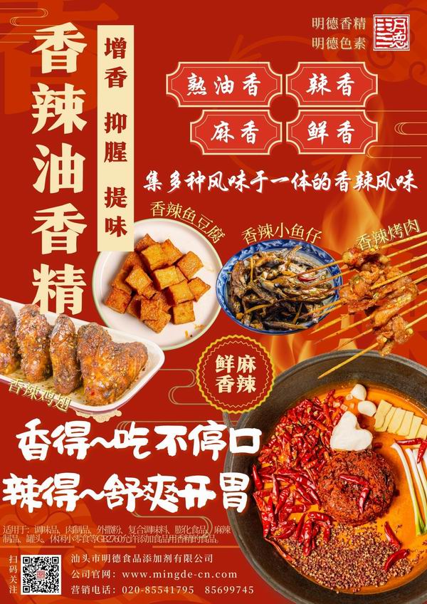 明德 麻辣醬香精、香辣醬香精 香飄四溢。麻麻辣辣的川味麻辣香、鮮香與濃厚的醬香相融合。香噴噴的香辣醬風味,具備辣醬的醬香和辣香味交融,回味悠長,令人垂涎欲滴。