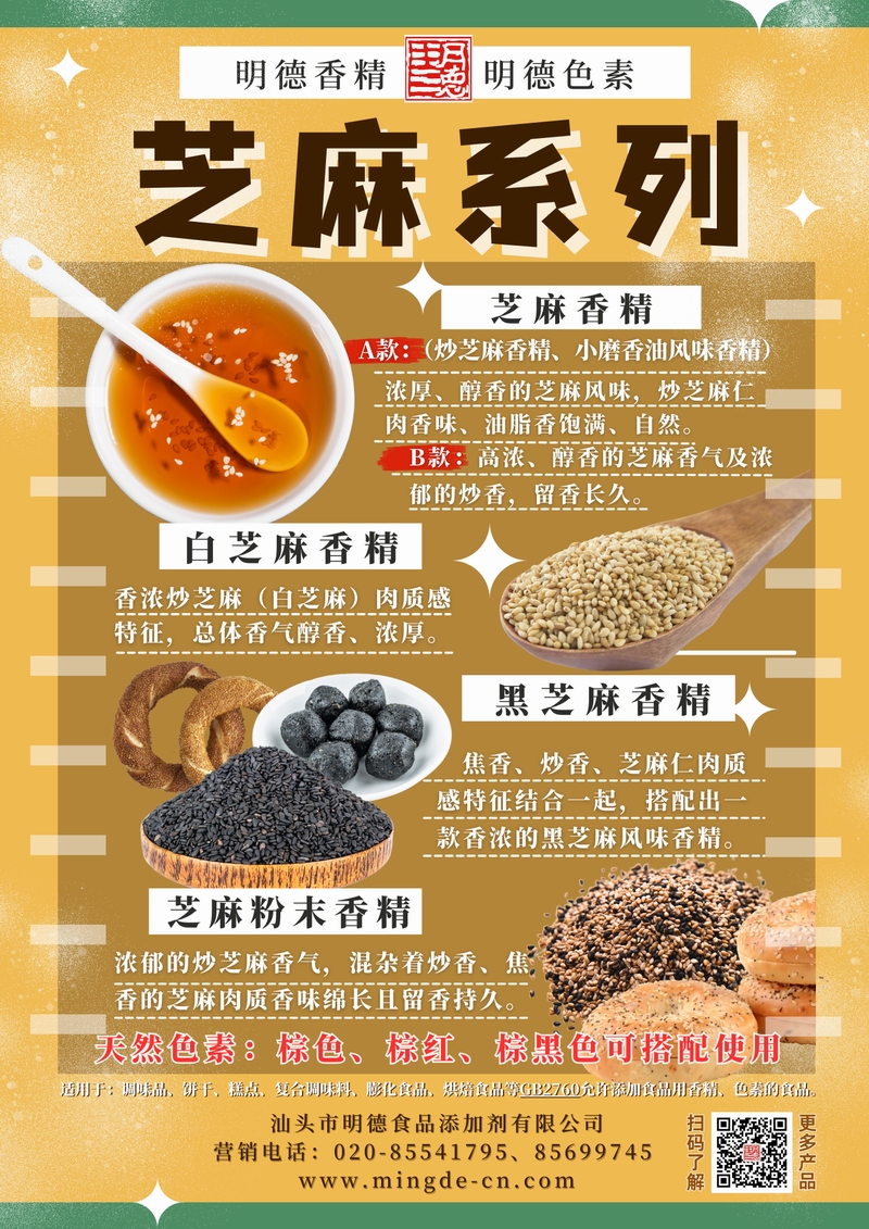 明德芝麻系列香精 | 層層焙香 煥發(fā)芝麻新風(fēng)味汕頭明德食品添加劑有限公司出品的芝麻系列香精,特別適用于調(diào)味料、復(fù)合調(diào)味品、炒貨加工、調(diào)味油等行業(yè)。產(chǎn)品風(fēng)味自然濃郁,焙炒感真實,幫助工廠在終端產(chǎn)品中打造穩(wěn)定、富有記憶點的芝麻類風(fēng)味體驗。